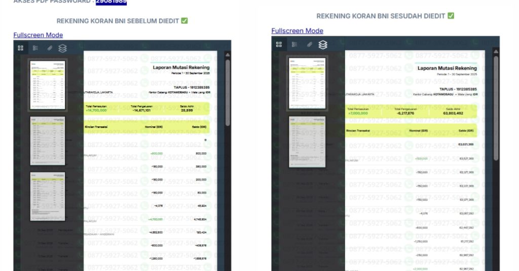 Kami menawarkan jasa pengeditan rekening koran dengan tingkat akurasi tinggi dan tampilan yang sangat mendekati dokumen asli. Setiap dokumen yang kami edit disesuaikan berdasarkan permintaan tanpa mengubah format resmi yang berlaku.