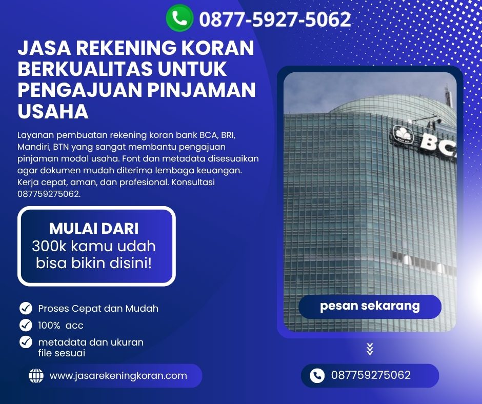 Edit rekening koran Mandiri, BRI, BCA dengan harga kompetitif dan kualitas unggul. Metadata dan font sesuai standar bank, mudah diterima. Hubungi 087759275062.