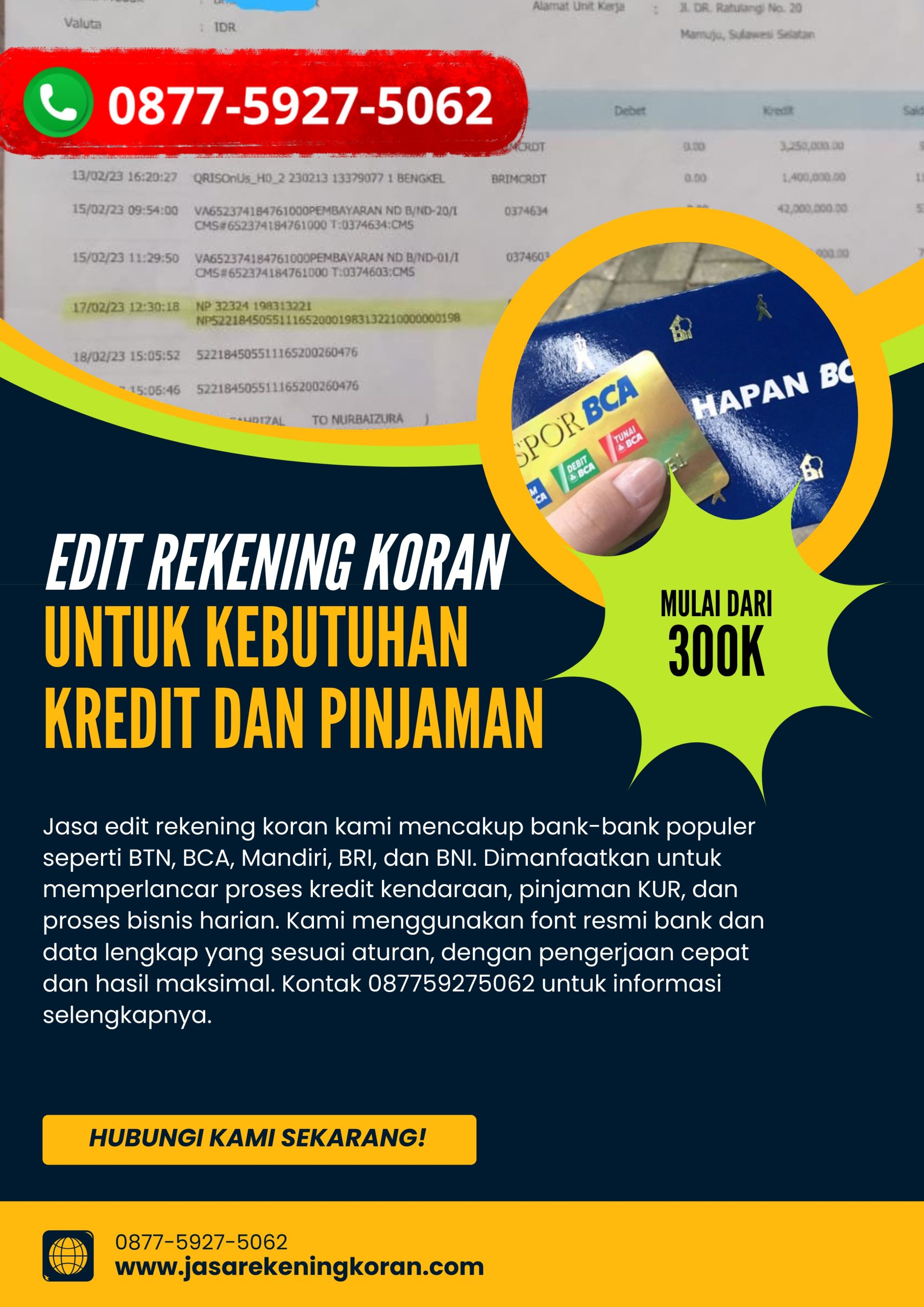 JASA EDIT REKENING KORAN UNTUK BANK BCA, BRI, MANDIRI, BNI, BANK BTN, CIMB NIAGA, BANK MEGA, DANAMON, BSI, BANK BJB, DAN LAINNYA: