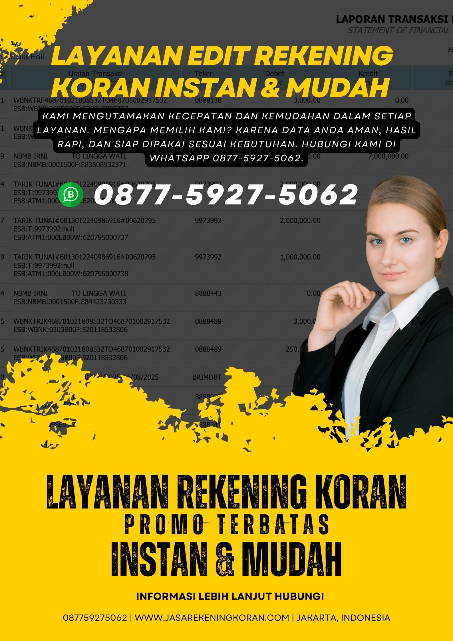 JASA EDIT REKENING KORAN UNTUK BANK BCA, BRI, MANDIRI, BNI, BANK BTN, CIMB NIAGA, BANK MEGA, DANAMON, BSI, BANK BJB, DAN LAINNYA: