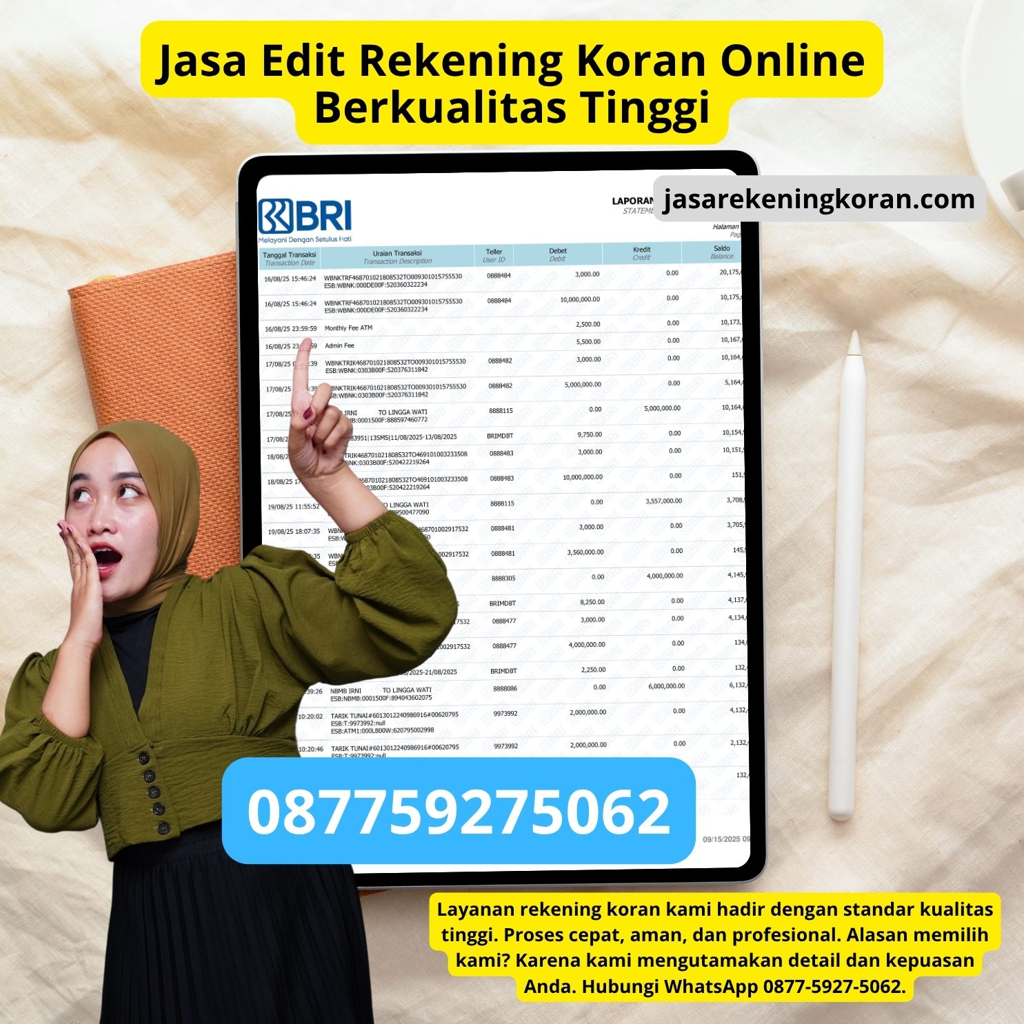 JASA EDIT REKENING KORAN UNTUK BANK BCA, BRI, MANDIRI, BNI, BANK BTN, CIMB NIAGA, BANK MEGA, DANAMON, BSI, BANK BJB, DAN LAINNYA: