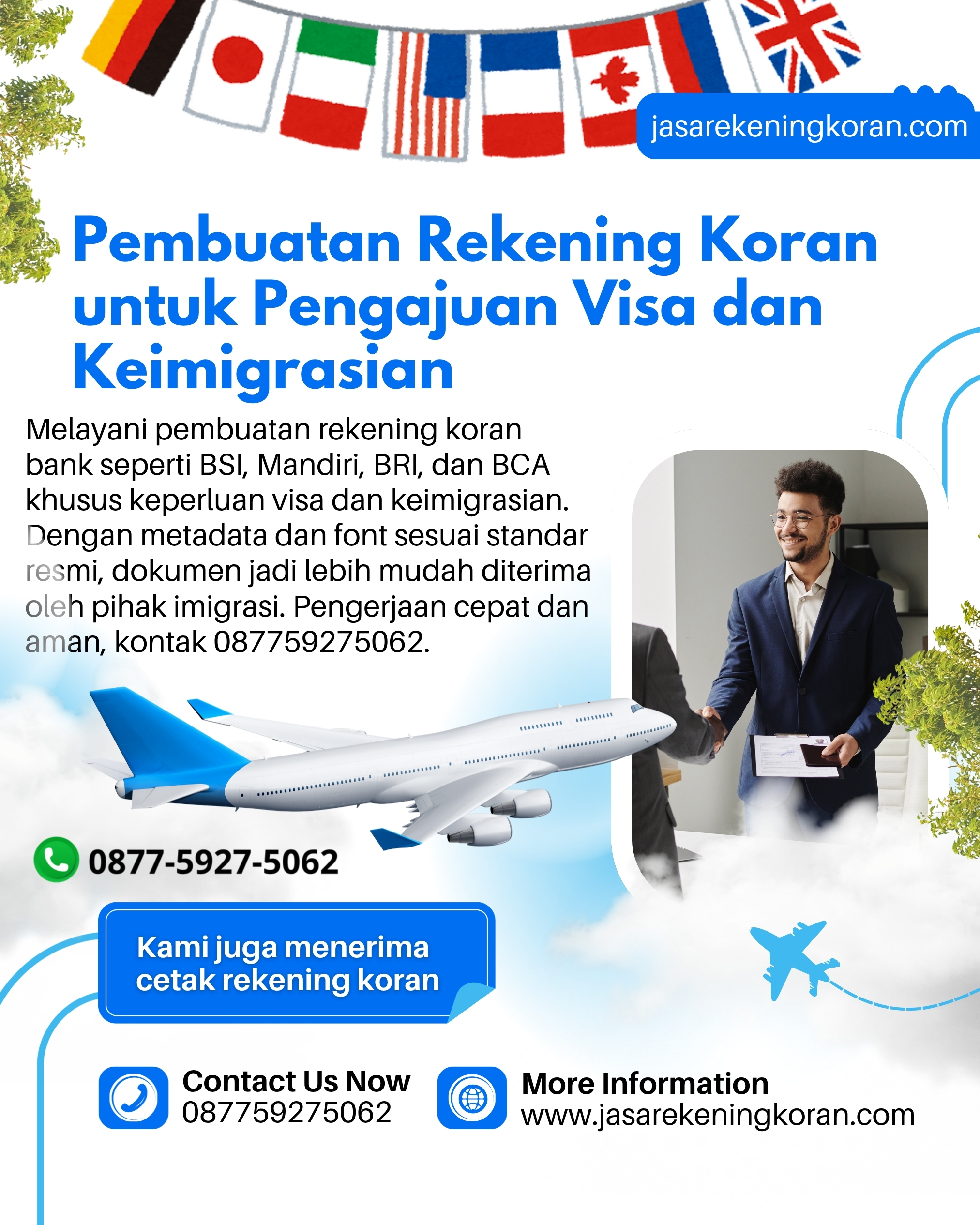 Kami membuat rekening koran berbagai bank seperti BCA, Mandiri, BRI untuk kelengkapan pengajuan kredit kendaraan bermotor. Hasil profesional dan valid. Hubungi 087759275062.